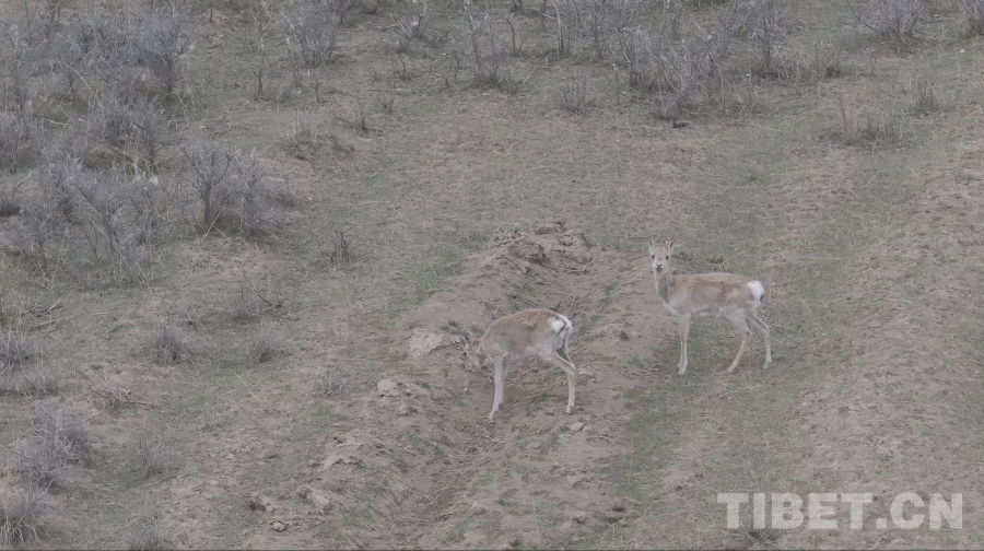 圖為無(wú)人機(jī)捕捉到的珍貴的野生普式原羚影像,它們的夏季被毛呈棕黃色,可以較好地融入周邊環(huán)境,同時(shí)性格警覺,對(duì)風(fēng)吹草動(dòng)都很敏感 青海省文旅廳供圖
