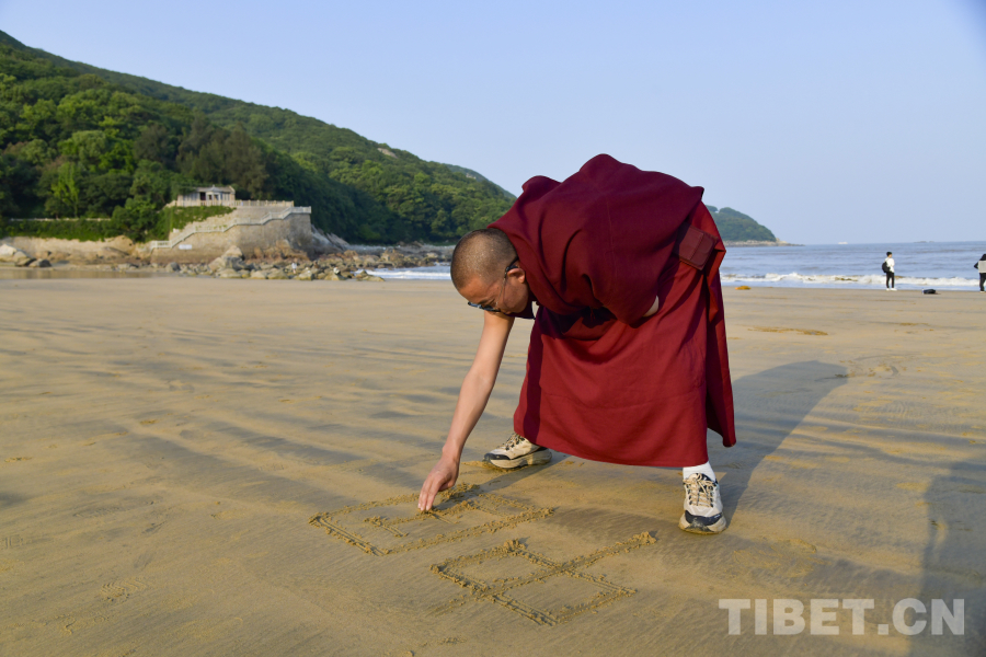 圖為西藏佛學(xué)院學(xué)員在東海岸邊寫(xiě)下中國(guó)二字 攝影:趙振宇