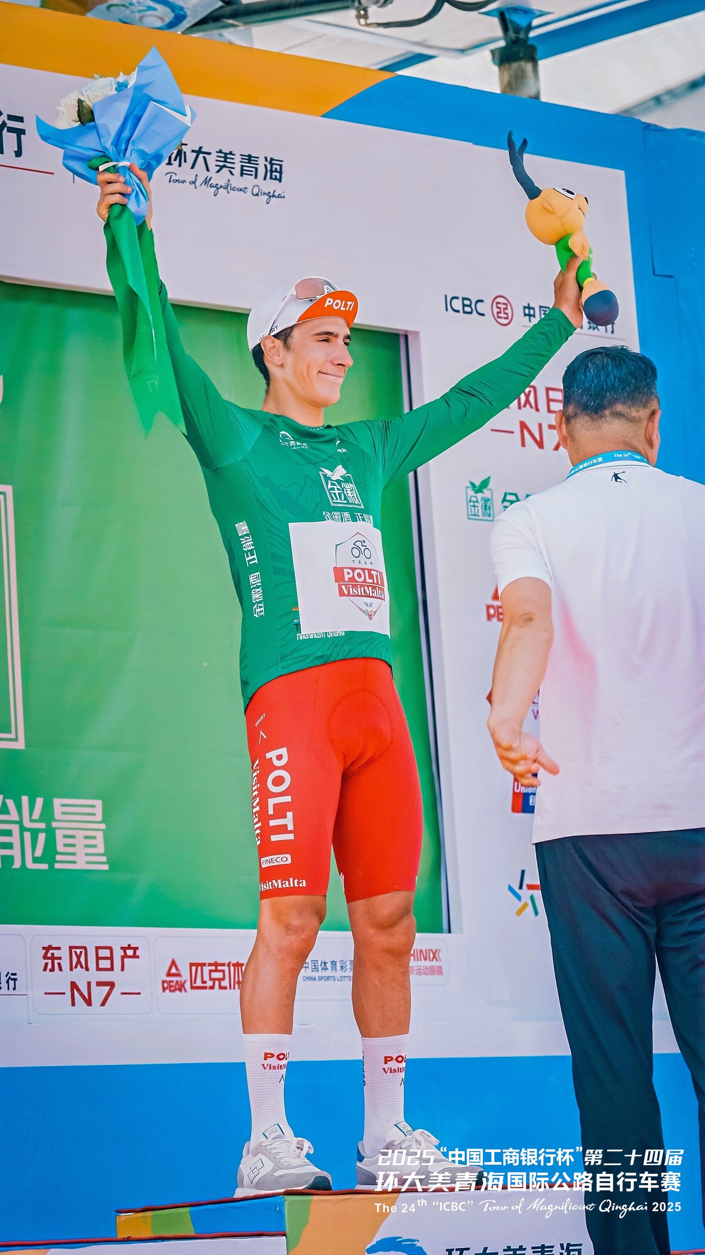 圖為本屆環(huán)青賽第一賽段結(jié)束后“綠衫”獲得者。