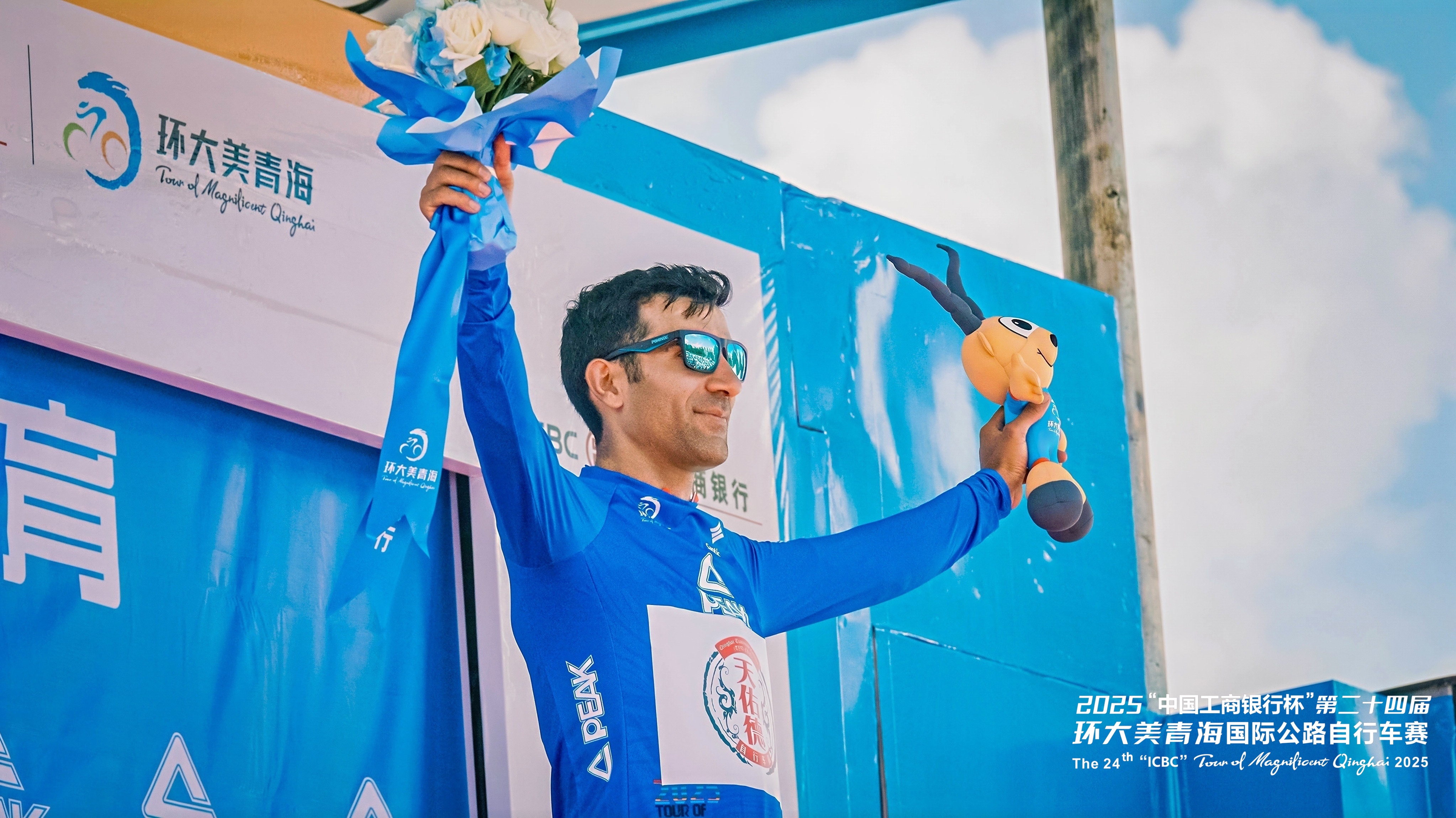 圖為本屆環(huán)青賽第一賽段結(jié)束后“藍衫”獲得者,相當(dāng)于“亞洲車手中的黃衫”。