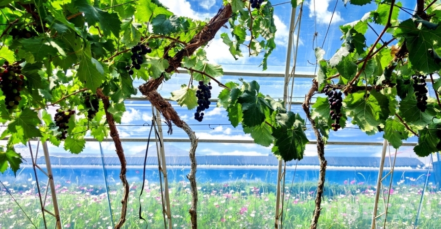 圖為才納園區(qū)溫室里正在成熟的葡萄。室外大片花朵開遍草地 攝影:劉莉