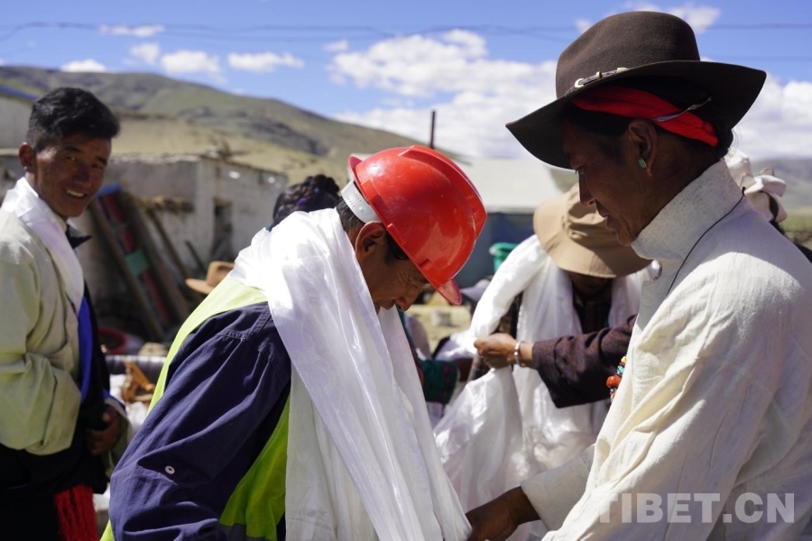 圖為封頂儀式上村民為施工隊工作人員獻哈達
