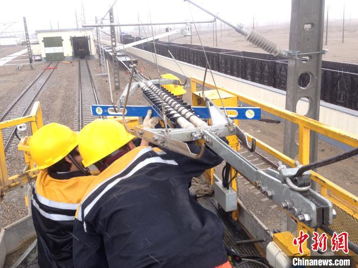 圖為中國鐵路青藏集團有限公司西寧供電段格爾木接觸網大修工區(qū)的接觸網工對分段絕緣器進行測量。周賀 攝