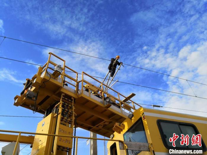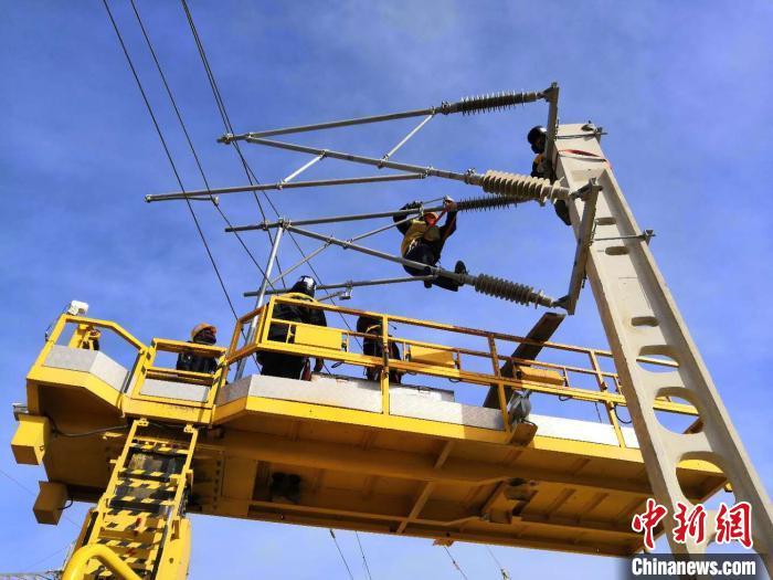 圖為中國鐵路青藏集團有限公司西寧供電段格爾木接觸網大修工區(qū)的接觸網工在檢修接觸網。周賀 攝
