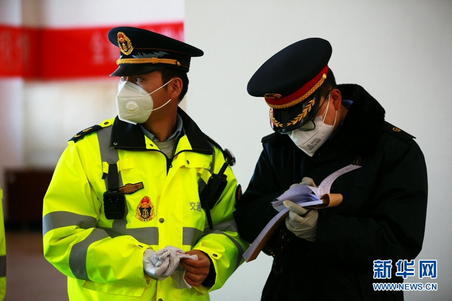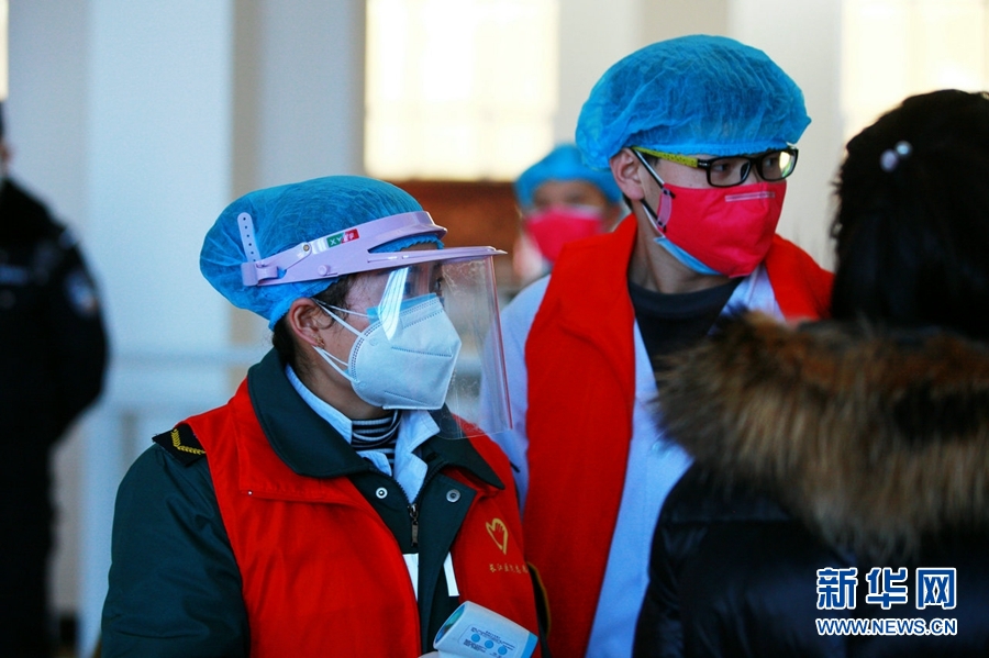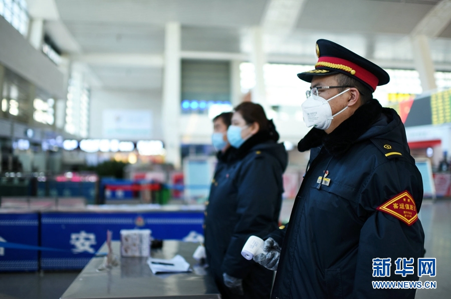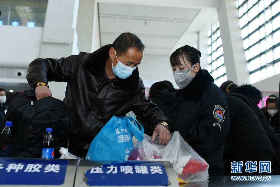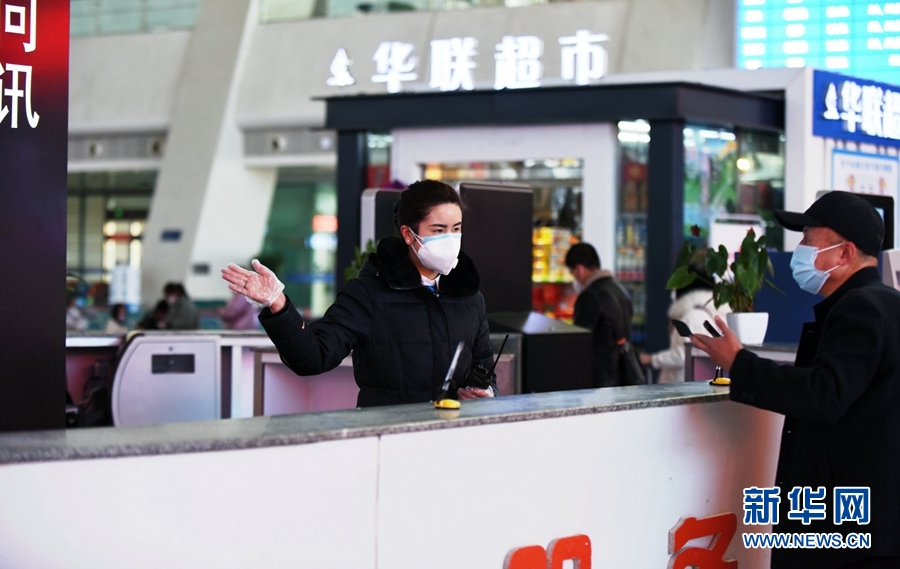在西寧站進(jìn)站口,工作人員為每名進(jìn)站旅客進(jìn)行測量體溫。新華網(wǎng) 李俊 攝