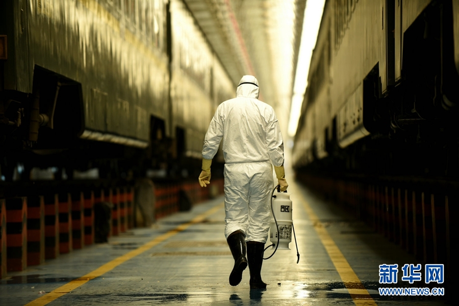 工作人員對每一列旅客列車進(jìn)行消毒作業(yè)。新華網(wǎng) 郝寶君 攝