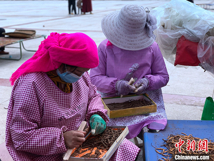 圖為6月13日,交易市場(chǎng)內(nèi)正在清刷蟲草上泥土的刷草工。中新社記者 李江寧 攝