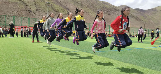 新修的操場是他“套路”到的,400米的標(biāo)準(zhǔn)跑道,比縣里小學(xué)的那個還好。這原本是鄉(xiāng)里的文體設(shè)施,班瑪多杰軟磨硬泡,央求著領(lǐng)導(dǎo)批準(zhǔn),把這個操場修到了學(xué)校旁邊?!傲弧敝?,一場運(yùn)動會就在這個操場上舉辦了。跑步,拔河,跳遠(yuǎn)……
