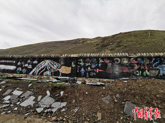 學(xué)校里有一面墻,現(xiàn)代文明的痕跡與傳統(tǒng)游牧的習(xí)俗,被學(xué)生們畫在了一起。畫上有五彩經(jīng)幡、雪山羊群,有絢麗的格桑花和溫暖的氈房,以及穿著藏袍大笑的孩子。畫上還有直升飛機(jī)、火箭和飛碟。