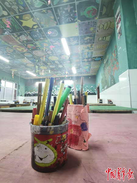 滿掌鄉(xiāng)小學(xué)有專門的音樂課和美術(shù)課教室,音樂教室里有鋼琴和電子琴,還有個沒人彈過的古箏。美術(shù)教室布置得極熱鬧,天花板上都有老師和學(xué)生們的涂鴉。