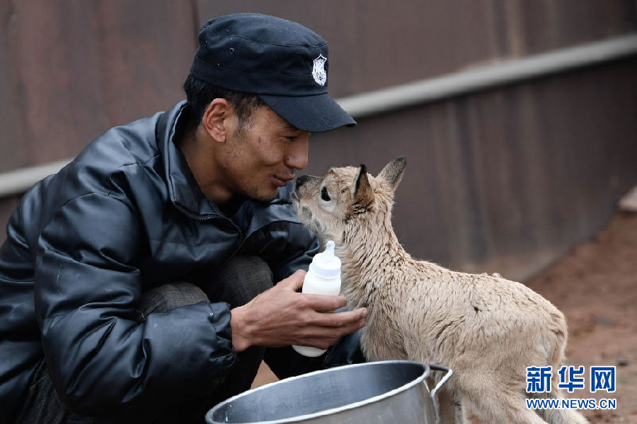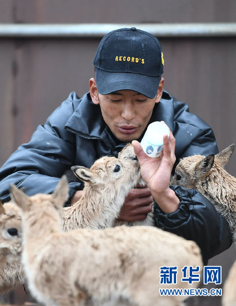 7月7日,三江源國(guó)家公園管理局長(zhǎng)江源園區(qū)可可西里管理處卓乃湖保護(hù)站的工作人員才文多杰在給藏羚羊幼仔喂奶。新華社記者 薛玉斌攝