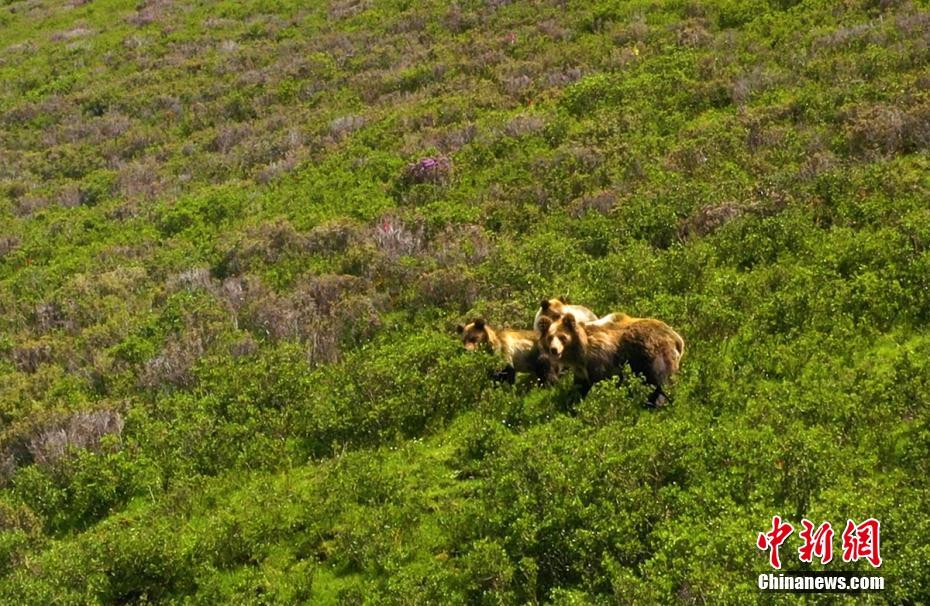 棕熊媽媽帶著3只熊寶寶行走在山坡上。秦晉翔 攝