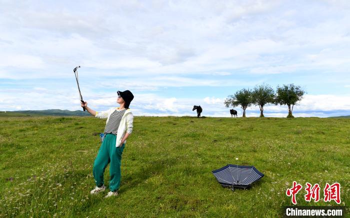 游客在紅原日干喬草地自拍留念。安源 攝