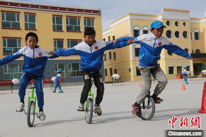 圖為鄉(xiāng)村學校少年宮的孩子們正在騎獨輪車。才讓本 攝