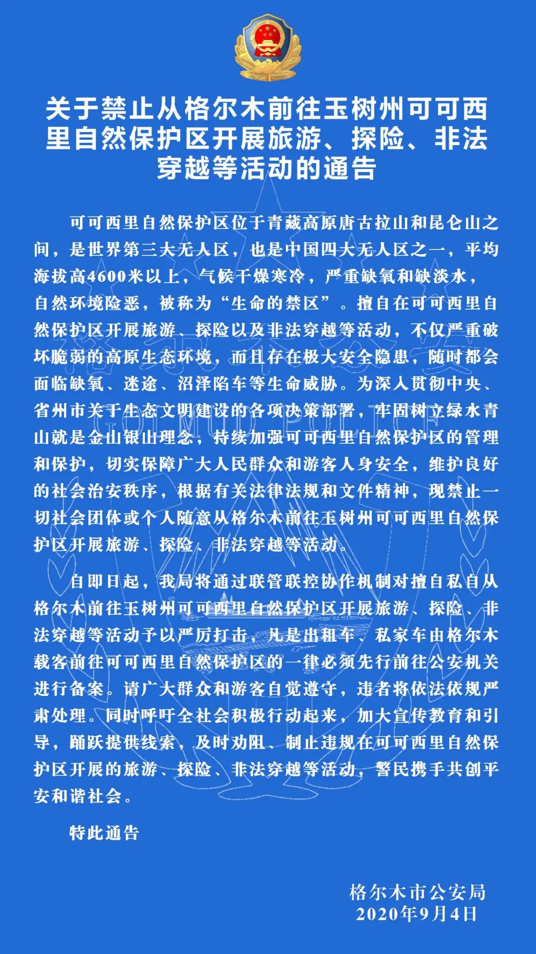 據(jù)格爾木公安微信公眾號消息,9月4日,青海省格爾木市公安局發(fā)布通告,禁止一切社會團(tuán)體或個人隨意從格爾木前往玉樹州可可西里自然保護(hù)區(qū)開展旅游、探險、非法穿越等活動,即日起將對上述行為予以嚴(yán)厲打擊,凡是出租車、私家車由格爾木載客前往可可西里自然保護(hù)區(qū)的一律必須先行前往公安機(jī)關(guān)進(jìn)行備案。