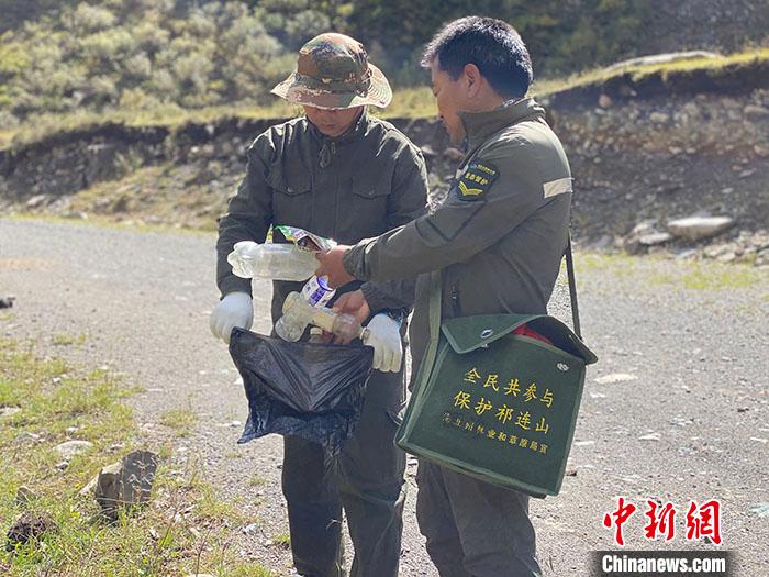 圖為9月9日,生態(tài)管護(hù)員王學(xué)清(右)在巡護(hù)過程中撿拾垃圾。 中新社記者 李江寧 攝