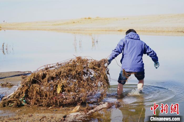 圖為尖木措將淤泥中的廢棄鐵絲拉上岸?!∥乃碱?攝