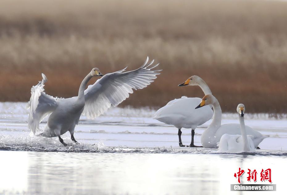 連日來,成群的野生大天鵝陸續(xù)飛臨四川省阿壩藏族羌族自治州若爾蓋縣高原小鎮(zhèn)麥溪鄉(xiāng)的洛賈瓊果河棲息越冬。這些跨越千里來此越冬的精靈讓洛賈瓊果河充滿了童話色彩,近百只天鵝在偌大的湖面上自由自在地覓食嬉戲,一會兒在天空翱翔,一會兒又成群結(jié)隊地在湖面上追逐,時而淺吟低唱,時而引吭高歌,時而振翅高飛,愜意十足,為冰封雪凍的高原濕地增添了些許靈動與生機,成為草原冰雪世界一道靚麗的風景。