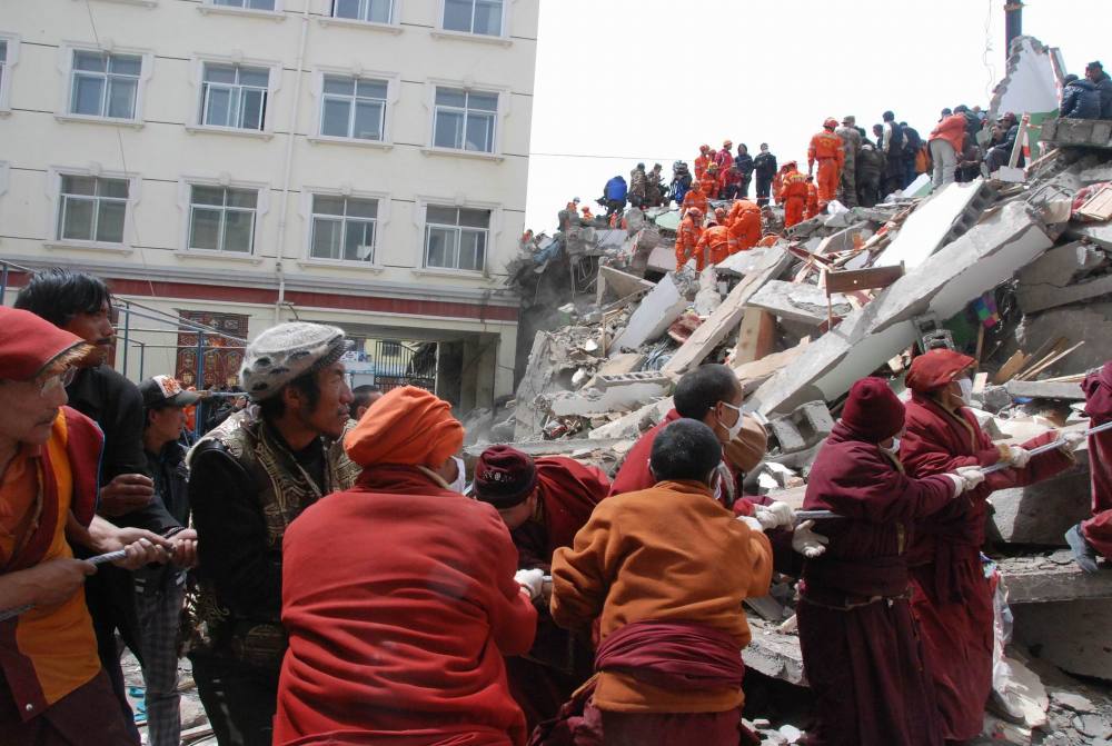 圖為2010年4月16日,救援人員在結古寺賓館進行救援。