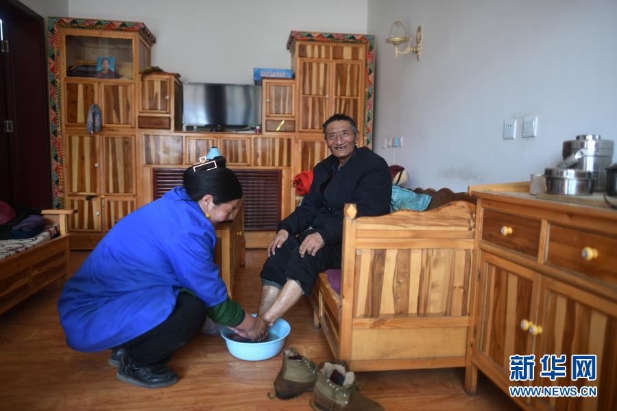 3月14日,幸福敬老院一名護工為索保尼瑪老人洗腳。新華社記者 張宏祥 攝