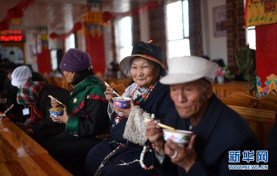 3月14日,在治多縣幸福敬老院食堂內,哈沙卡卓(右二)在吃午餐。新華社記者 張宏祥 攝