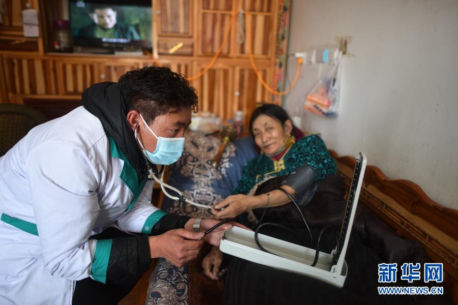 3月14日,幸福敬老院醫(yī)務室醫(yī)生土丁西周(左)為老人測量血壓。新華社記者 張宏祥 攝