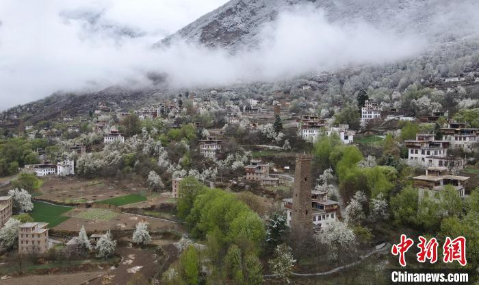 山坡上一幢幢藏式樓房灑落在梨花、綠樹叢中美如畫。劉忠俊 攝