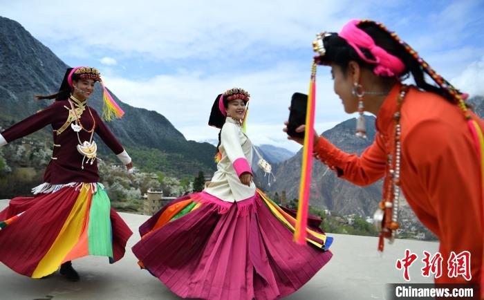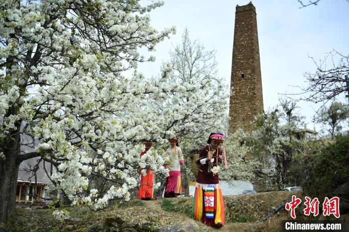藏寨、碉樓下盛開的梨花,丹巴女孩穿梭鄉(xiāng)間小路。劉忠俊 攝