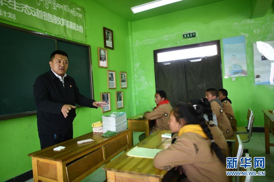 3月23日,索南旦正(左)在吉尕小學(xué)青少年生態(tài)道德教育基地授課。新華社記者 張宏祥 攝