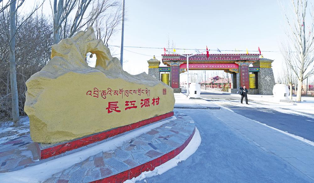 從格爾木市區(qū)沿109國道一路向南,車子行駛在廣闊平坦的公路上,窗外的景色緩緩?fù)撕?。忽然間,路旁一塊刻有“長江源村”字樣的巨石撲入眼簾,像一面破浪前行的風(fēng)帆,亦像一座拔地而起的豐碑,與一旁極具藏民族特色的大門交相輝映。站在村口放眼望去,一排排藏式風(fēng)格的庭院錯(cuò)落有致,屋頂上一面面五星紅旗獵獵招展,將湛藍(lán)的天空映襯得分外純凈。