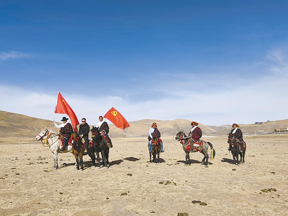 在玉樹藏族自治州曲麻萊縣葉格鄉(xiāng)龍麻村,一陣馬蹄聲由遠而近,牧民江措趕忙放下手中的活從帳篷里探出頭來,定睛一看,幾個熟悉的身影進入視線。走在最前面的干部手拿一面鮮紅的黨旗隨風飄動,江措激動地向大家打起了招呼。