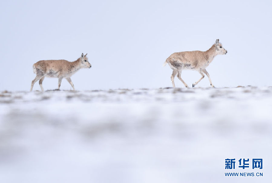 4月20日,兩只藏羚羊向卓乃湖方向行進(jìn)。新華社記者 吳剛 攝