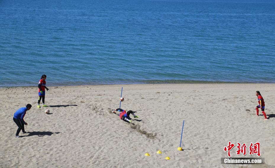 青海湖民族寄宿制學校女子足球隊的隊員們在青海湖畔沙灘上進行訓練。中新社記者 馬銘言 攝