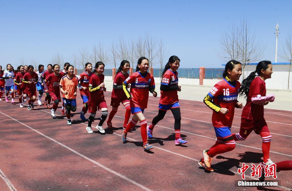 青海湖民族寄宿制學校的足球場上,女子足球隊的隊員們正在進行跑步熱身。中新社記者 馬銘言 攝