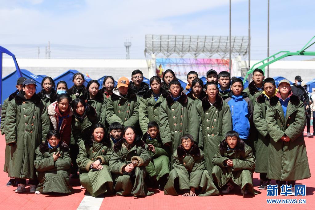 5月24日,曲邁卓瑪與同學(xué)們?cè)诂敹嗫h民族寄宿制中學(xué)合影。新華社 張龍 攝