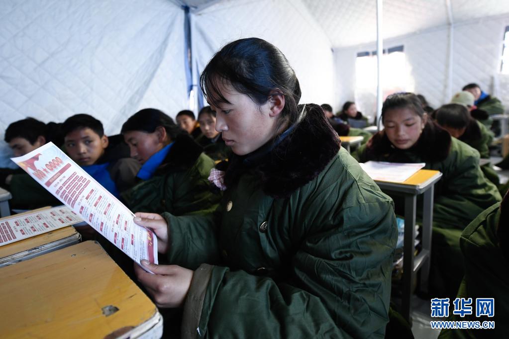 5月24日,曲邁卓瑪在瑪多縣民族寄宿制中學(xué)帳篷教室里學(xué)習(xí)防災(zāi)避險(xiǎn)知識(shí)。新華社 張龍 攝