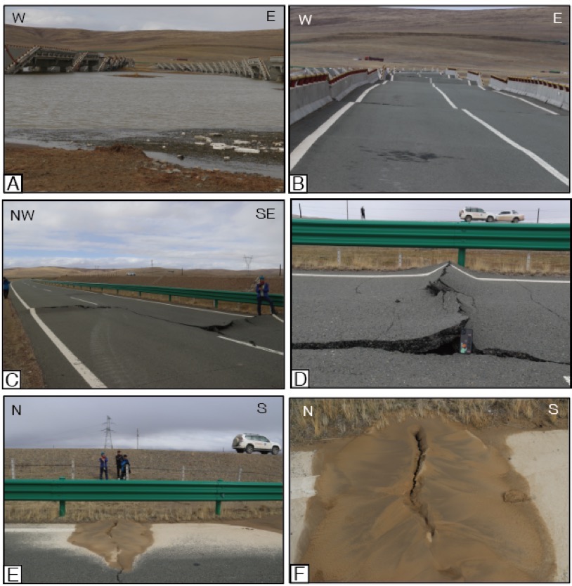 應(yīng)急考察隊(duì)還發(fā)現(xiàn),G214野馬灘大橋附近地表破裂極為明顯,破裂帶寬度5至8米不等,出現(xiàn)大量砂土液化現(xiàn)象,部分砂土液化點(diǎn)仍在冒水。G214野馬灘大橋受本次地震破壞嚴(yán)重,橋體坍塌,呈多米諾式,橋面一致向南。大橋南端公路路面造成路面擠壓突起,雙向車道擠壓突起不一致,最高突起達(dá)20厘米。