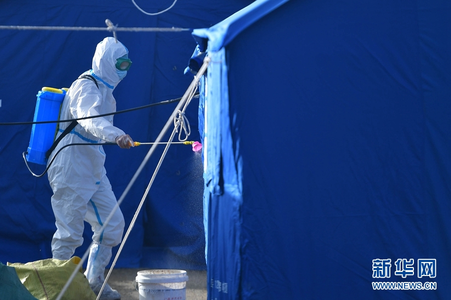 5月26日,一名工作人員在瑪多縣黃河鄉(xiāng)安置點內(nèi)進行消殺作業(yè)。