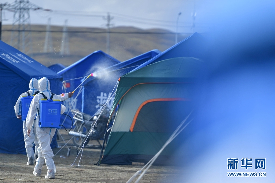 5月26日,兩名工作人員在瑪多縣黃河鄉(xiāng)安置點內(nèi)進行消殺作業(yè)。