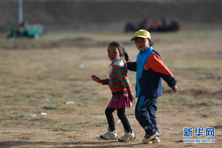 5月26日,兩名小朋友在瑪多縣瑪查理鎮(zhèn)安置點內(nèi)玩耍。