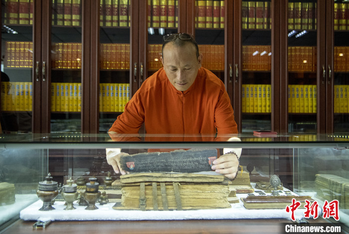 7月8日,四川成都,喜馬拉雅文庫總編輯才讓多吉在《格薩爾》資料中心整理館藏經(jīng)書。中新社記者 劉忠俊 攝
