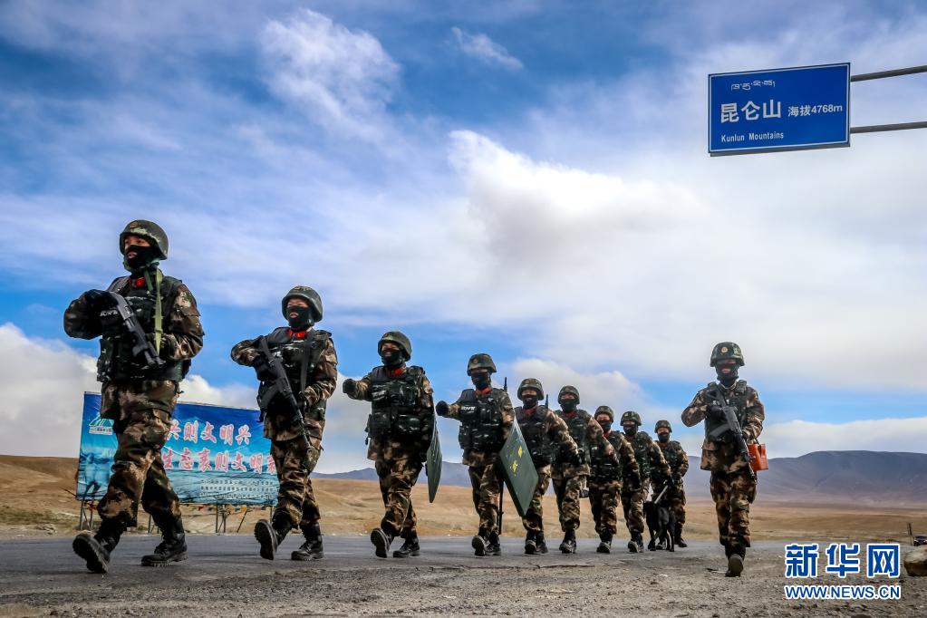 武警青??傟爤?zhí)勤支隊執(zhí)勤七中隊官兵在昆侖山口巡邏(2月3日攝)。新華社 楊浩 攝