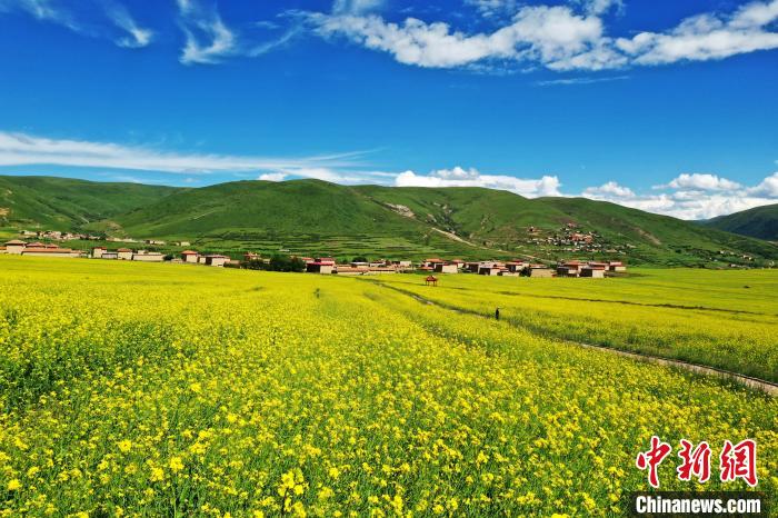 7月21日,四川省阿壩藏族羌族自治州阿壩縣麥昆鄉(xiāng)蠶不扎村高原油菜核心示范基地內(nèi),盛開的萬畝高原油菜花海吸引游客前來觀光打卡。