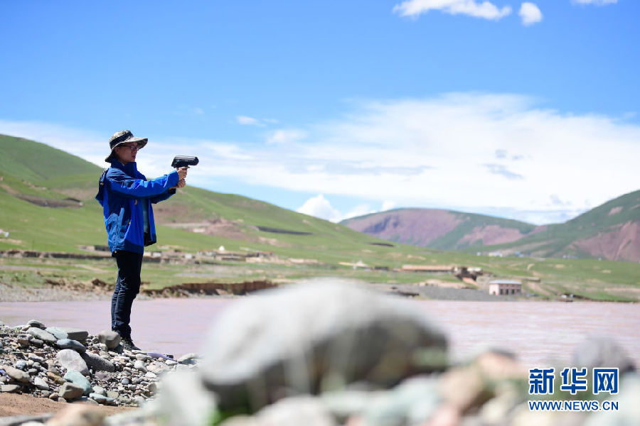 2021年長江源綜合科考的科考隊(duì)員趙良元在通天河流域觀測水文(7月24日攝)。新華社記者 張龍 攝