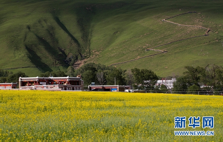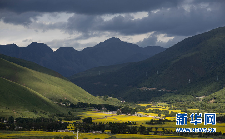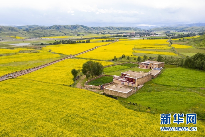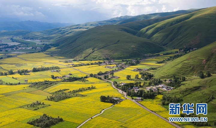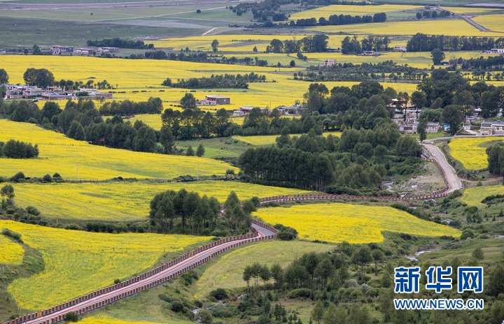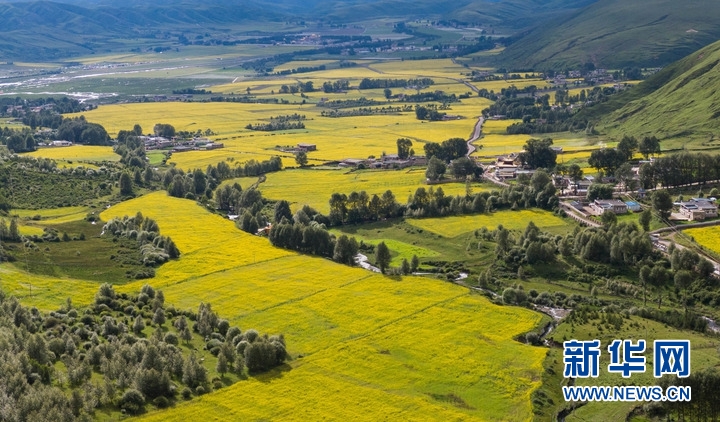 7月24日,在道孚縣泰寧鎮(zhèn),民居點(diǎn)綴在成片的油菜花海中。新華社記者 江宏景 攝