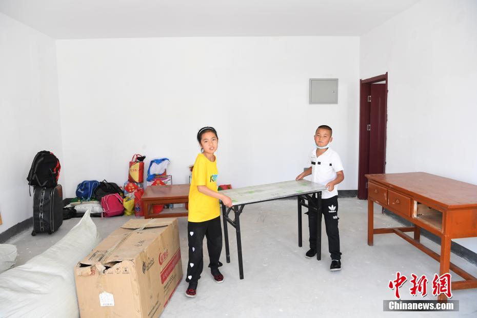 8月7日,甘肅省舟曲縣首批60戶289名地質(zhì)災(zāi)害避險搬遷村民到達(dá)蘭州新區(qū)并入住,11歲小女孩虎紅霞和弟弟在新家內(nèi)整理家具。甘肅舟曲縣啟動地質(zhì)災(zāi)害避險搬遷工作,第一批次60戶289人集中告別故土,乘車前往數(shù)百公里之外的蘭州新區(qū)。 中新社記者 楊艷敏 攝