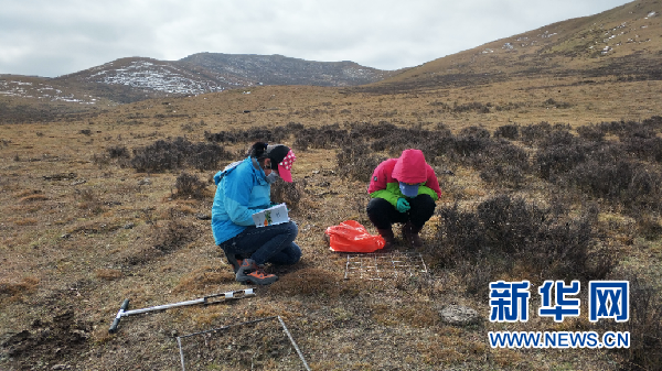 郭娜(右)和同學(xué)在進(jìn)行春季牧場的植被調(diào)查。(受訪者供圖)