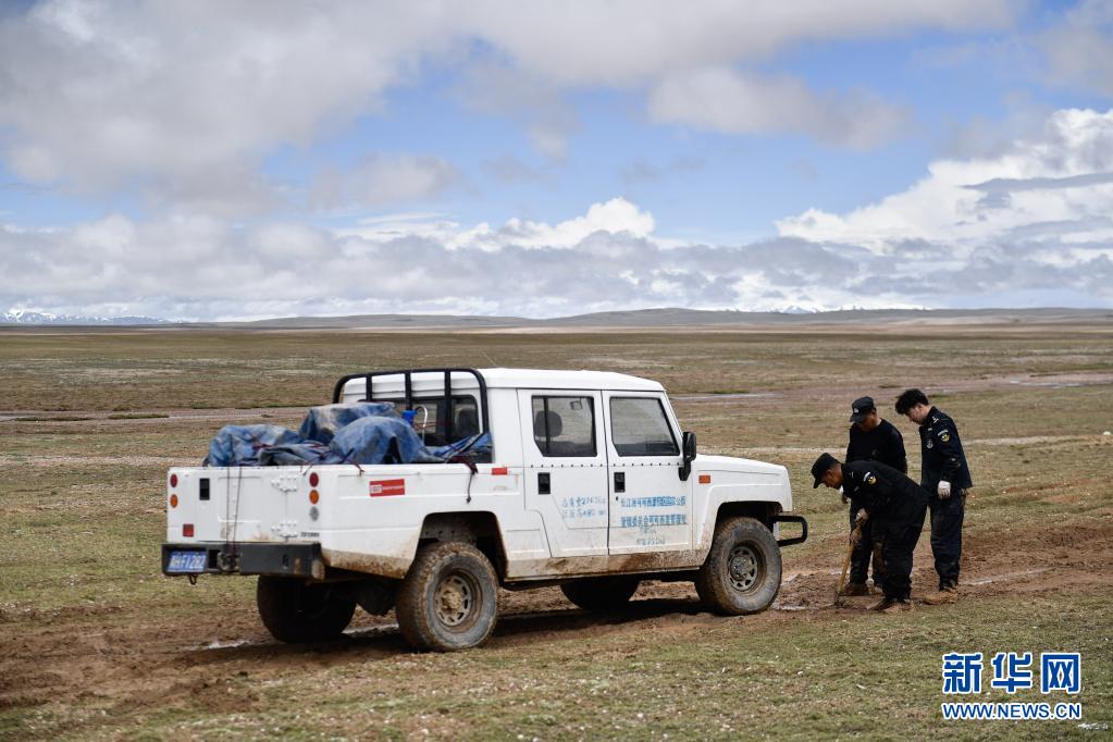 在前往可可西里卓乃湖保護(hù)站途中,巡山隊(duì)員將車輛移出泥坑(2020年7月6日攝)。新華社 張龍 攝