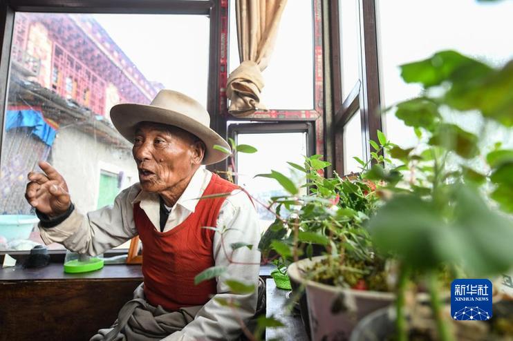 甲洼鎮(zhèn)卡娘村村民阿多講述紅軍當(dāng)年到達(dá)甲洼鎮(zhèn)的情景。 新華社記者 王曦 攝
