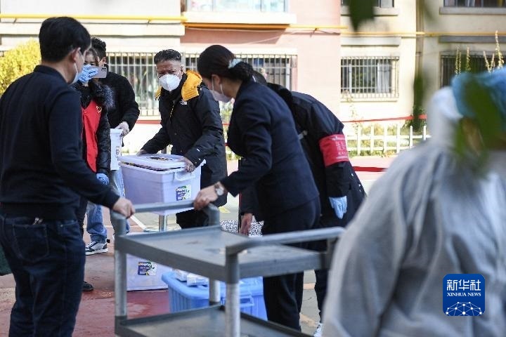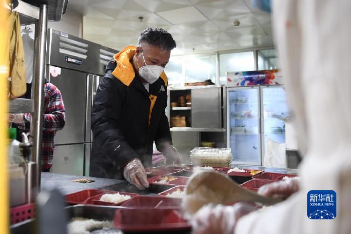 10月31日,羅宗周正在為西寧勝利路一社區(qū)核酸采樣點(diǎn)送餐。新華社記者 吳剛 攝